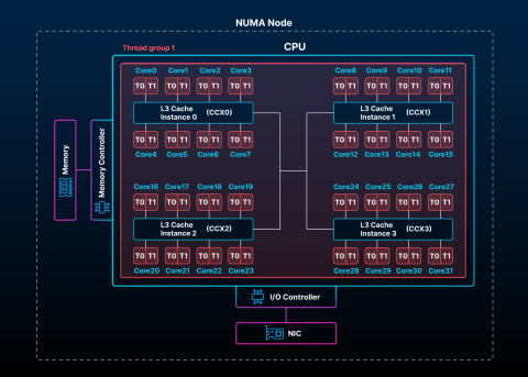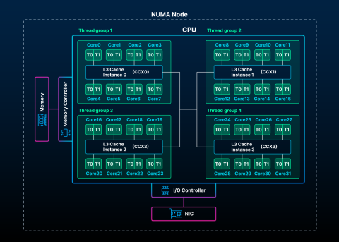 In these processors, cores are grouped into CCXs, or core complexes, where the cores that share L3 caches have the lowest latencies and are grouped together. Multiple CCXs may be colocated in a single CCD, or core complex die, and then one or more CCDs may make up a single NUMA node. The arrangement of cores, CCX, and nodes is referred to as CPU topology.