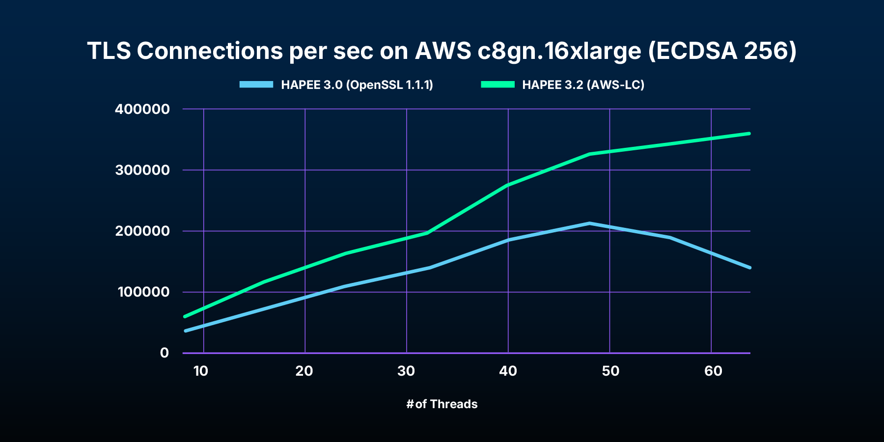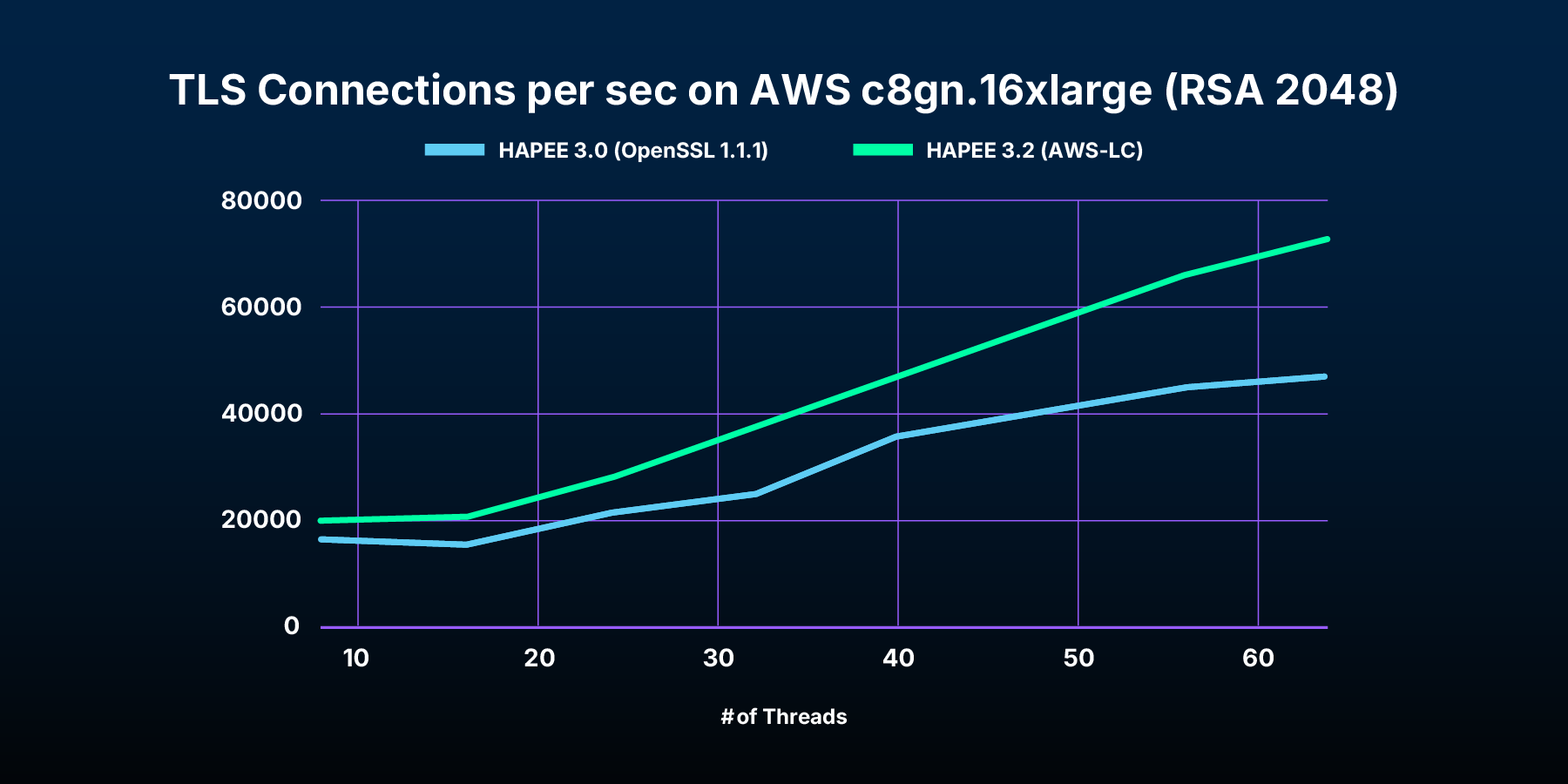]]> ]]> Two libraries stand out at the top and the bottom. At the top, above 63000 connections per second, in light blue, we’re seeing the latest version of AWS-LC (30 commits after v1.32.0), which includes important CPU-level optimizations for RSA calculations. Previous versions did not yield such results due to a mistake in the code that failed to properly detect the processor and enable the appropriate optimizations. The second fastest library, in orange, was WolfSSL 5.7.0. For a long time, we’ve known this library for being heavily optimized to run fast on modest hardware, so we’re not surprised and even pleased to see it in the top on such a powerful machine.