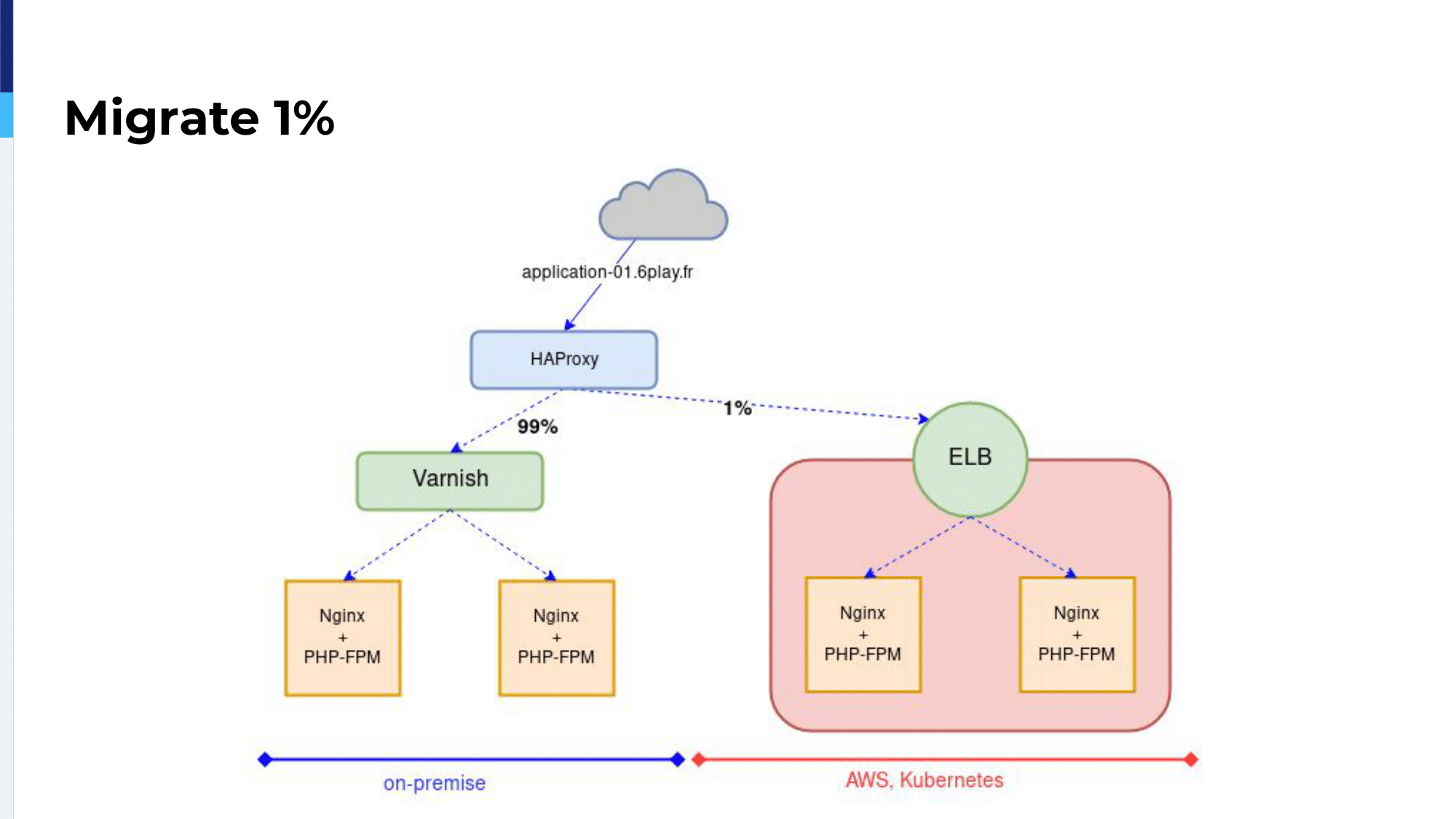 So, the first thing we did was to add HAProxy at the very top of our network. All the traffic for a specific application was going through HAProxy and at the beginning, HAProxy sent 1% of the traffic on-premises.