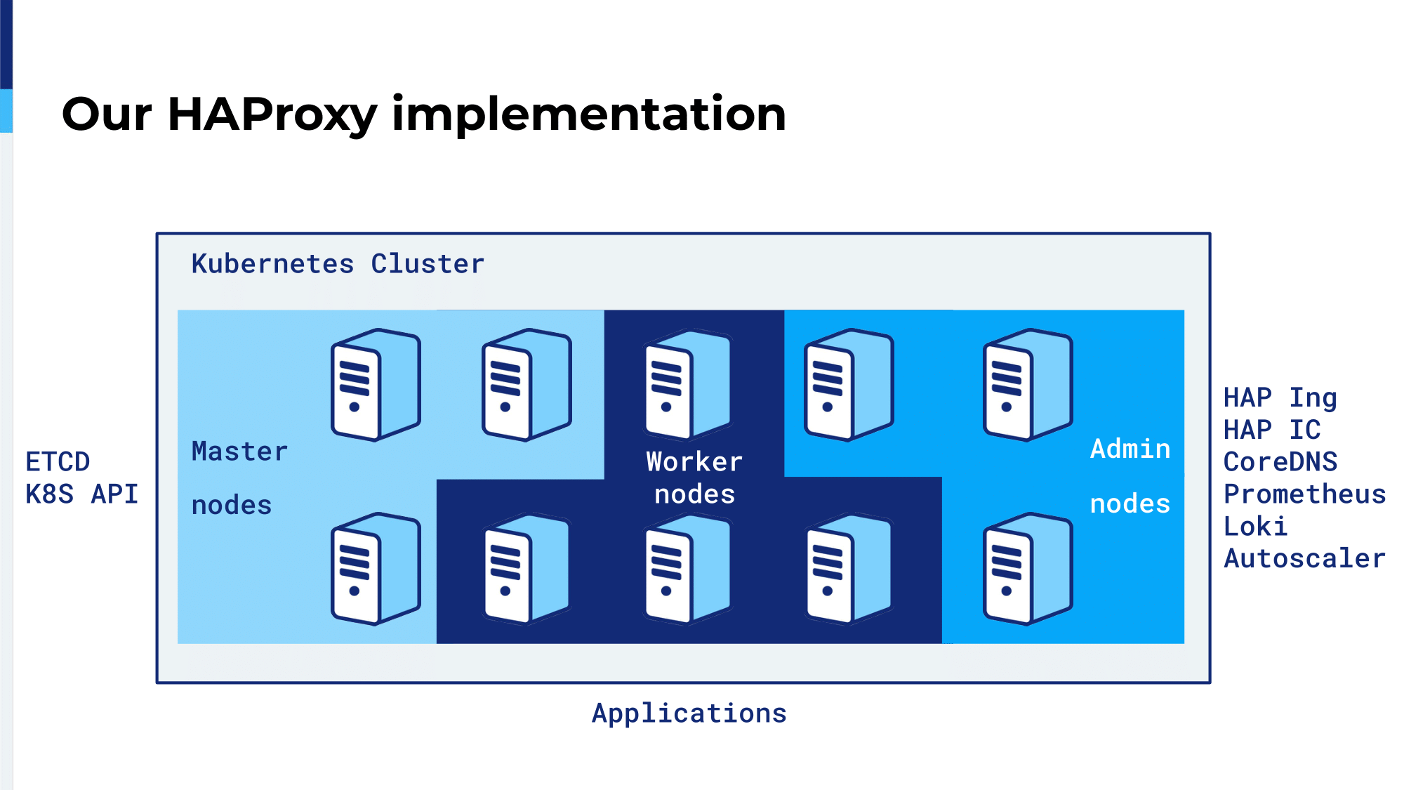 How we use the HAProxy Ingress Controller: We have a Kubernetes cluster in which we have some master nodes of the etcd parts and Kubernetes API and a lot of Kubernetes stuff. We have admin nodes and admin nodes are dedicated to administrator binaries like the HAProxy Ingress Controller. With the Ingress we have DNS, metrics, logging, autoscaling, everything that is administrator-related is deployed only on those admin nodes. The rest of the nodes are dedicated to our APIs and our applications.